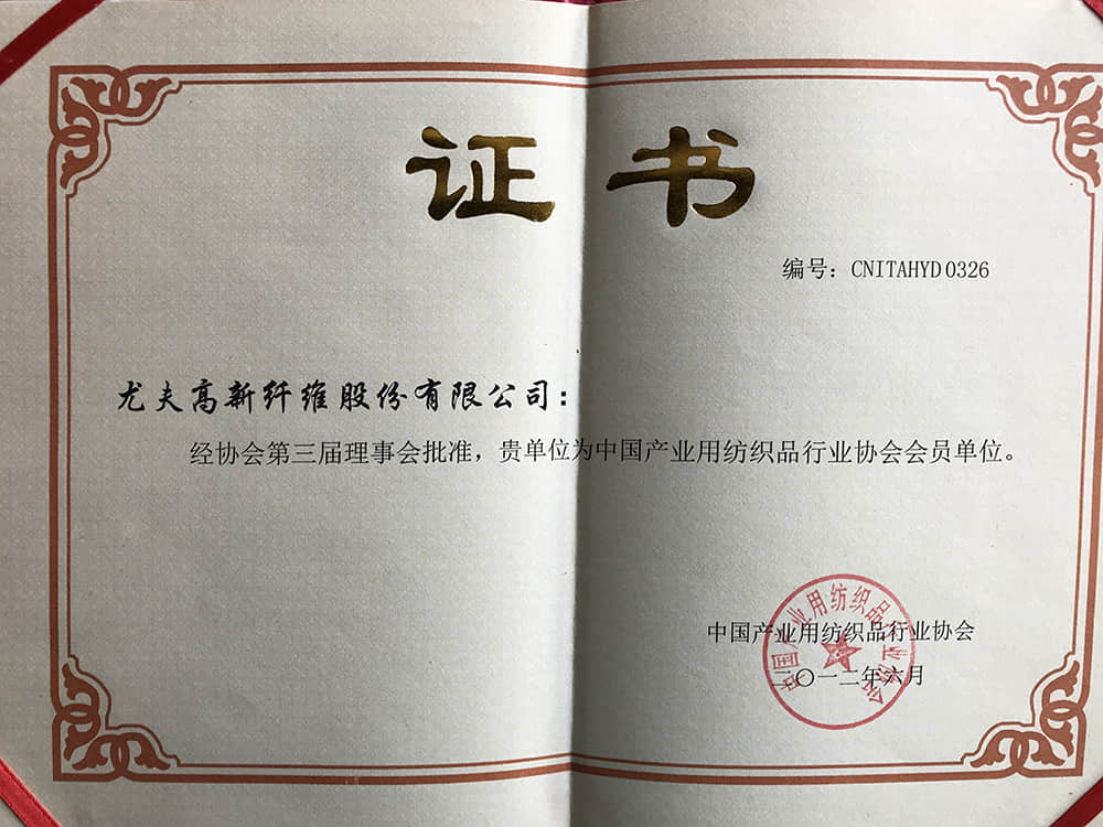 2012產(chǎn)業(yè)用紡織品行業(yè)協(xié)會(huì)會(huì)員單位證書(shū)